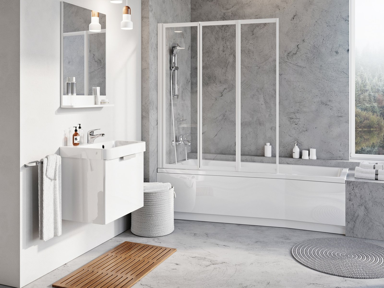 Praktikus és univerzális. Három mozgatható elemből áll, amelyet teljesen a kád belső terébe lehet hajtani, ezáltal még a kisebb fürdőszobákban is kényelmes zuhanyozást biztosít.